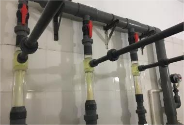 二氧化氯發(fā)生器一般由控制部分(如圖1)、反應(yīng)部分(如圖2)及投加部分(如圖3)及原料存儲部分組成。產(chǎn)生的時候,由計(jì)量泵按照預(yù)定比例將原料吸入反應(yīng)器中,待反應(yīng)完成后由水射器帶入投加點(diǎn)進(jìn)行投加,投加量與水質(zhì)有很大關(guān)系,在給水中投加量一般在0.1-0.5mg/L范圍內(nèi),在污水中一般在1-2mg/L范圍內(nèi),具體投加量應(yīng)進(jìn)行小試實(shí)驗(yàn),并以出水指標(biāo)為小試的要求。