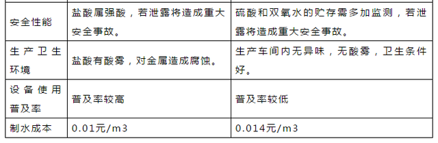鹽酸法及硫酸法(均采用氯酸鈉為原料)對比如表1所示(由于污水性質(zhì)較為復(fù)雜,成本為某江段同原水,同工藝,同出廠余二氧化氯量所計(jì)算成本):